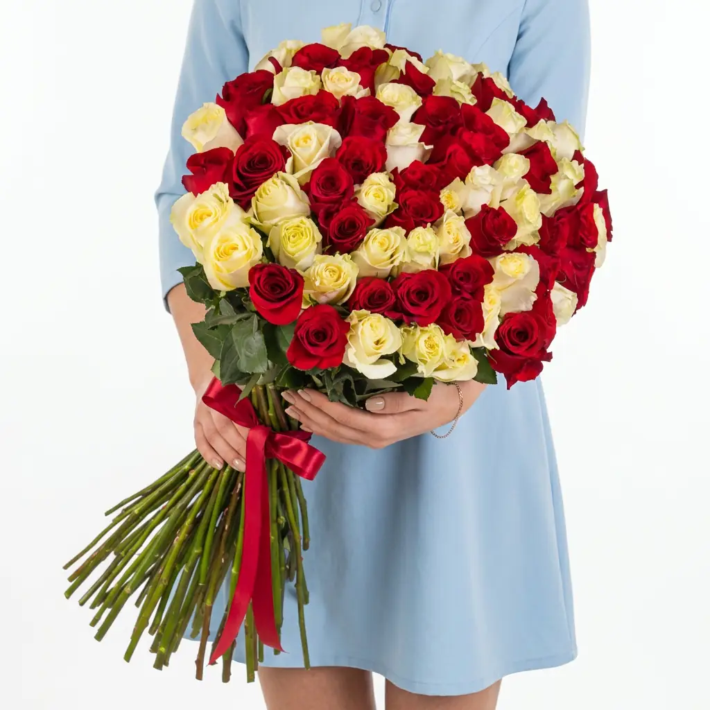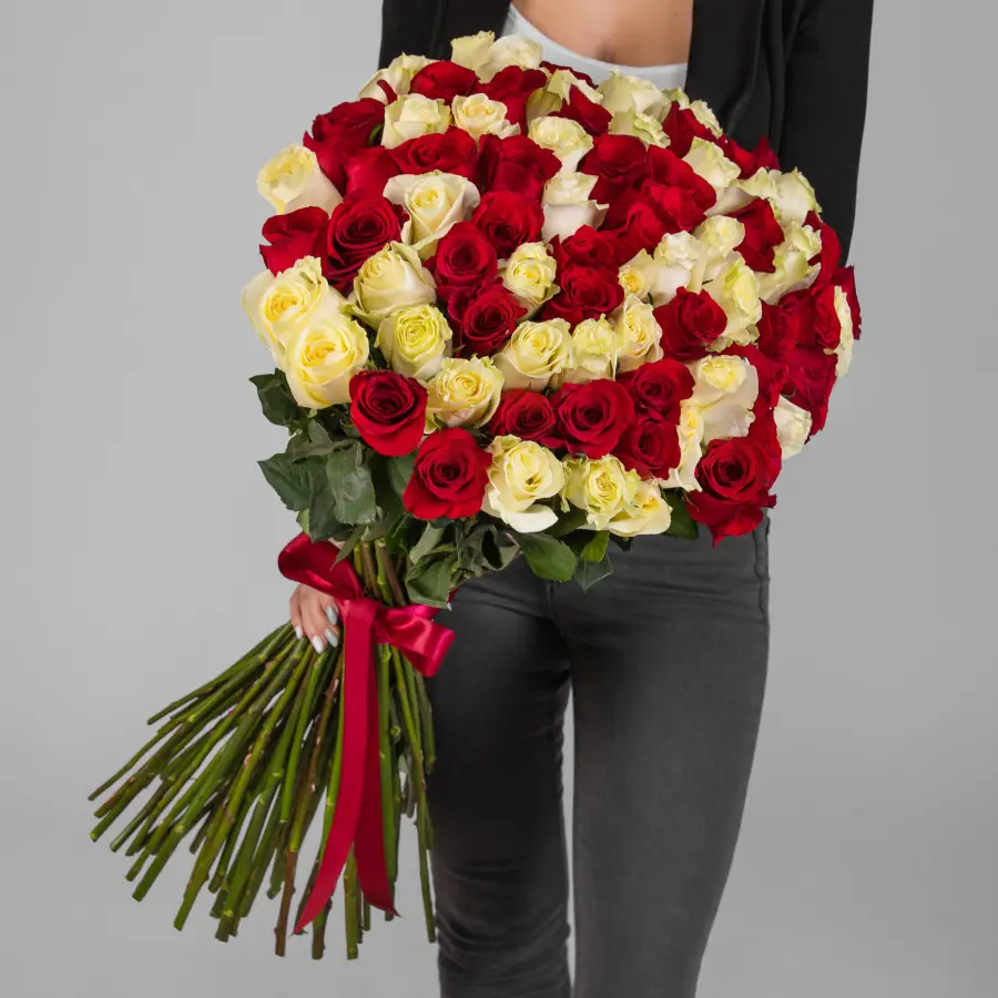 75 Красно-Белых Роз — купить по цене от 20300 руб. с доставкой в Нижнем Новгороде