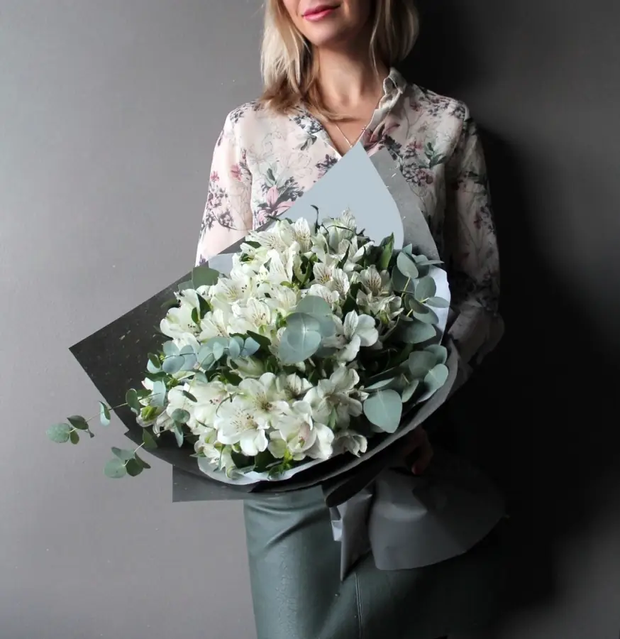 25 Белых Альстромерий с эвкалиптом в упаковке — купить по цене от 6970 руб. с доставкой в Нижнем Новгороде