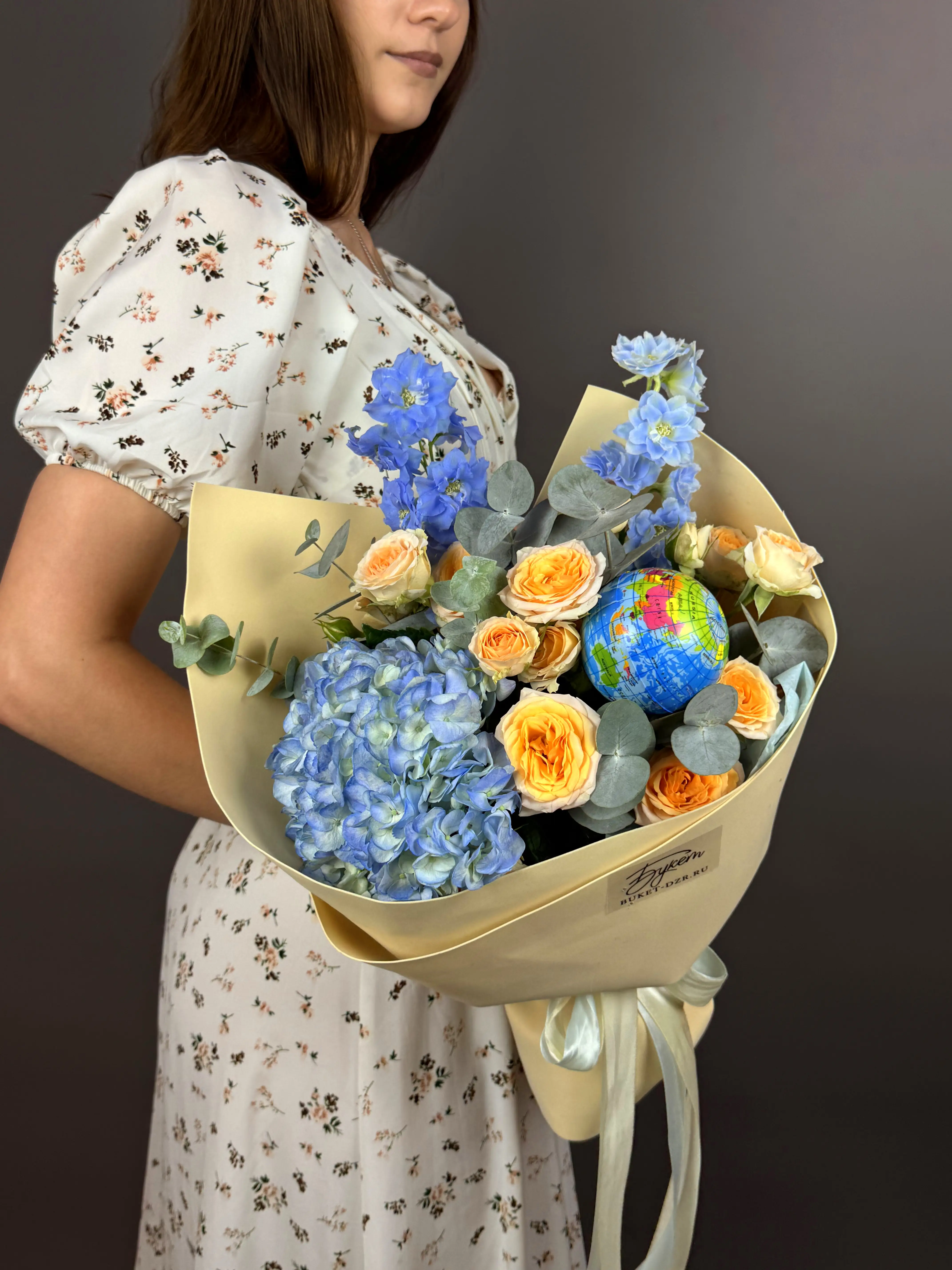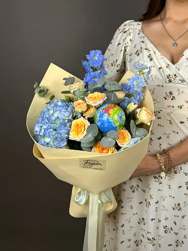 Букет с голубой гортензией и глобусом — отличный выбор для подарка! На сайте вы найдете красочные фотографии, которые помогут сделать выбор. Цена букета — 3720 руб.. Закажите Букет с голубой гортензией и глобусом с доставкой в Нижнем Новгороде и по области.