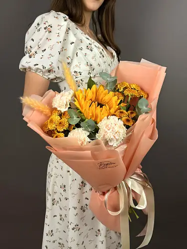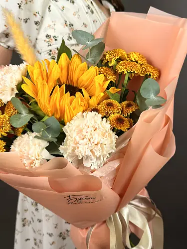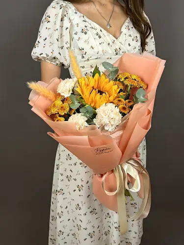 Солнечный букет с подсолнухом и диантусами — купить по цене от 3490 руб. с доставкой в Нижнем Новгороде