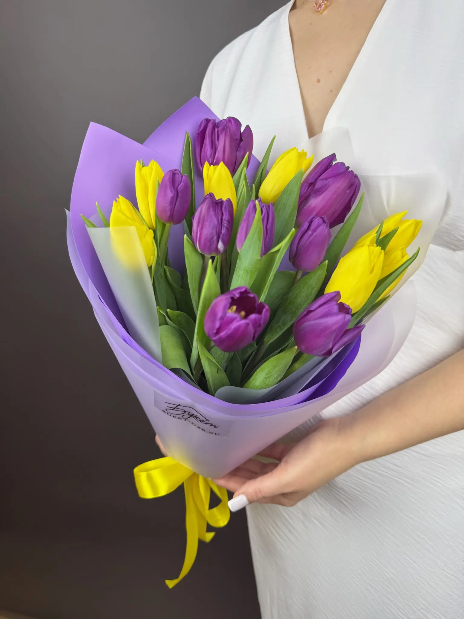 Букет из 15 Тюльпанов Желтого и Сиреневого цвета — купить по цене от 3450 руб. с доставкой в Нижнем Новгороде