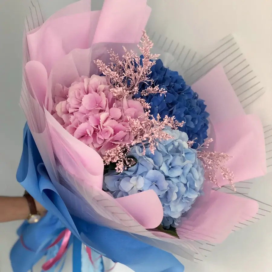 На фото - 3 Гортензий Микс. В составе данной композиции: Гортензия - 3 шт , Лимониум Розовый - 3 шт., Упаковка, Лента. На сайте sbuket-nn.ru Вы найдете большой выбор недорогих букетов, цветочных композиций для любого повода. У нас можно заказать 3 Гортензий Микс за 3550 руб.