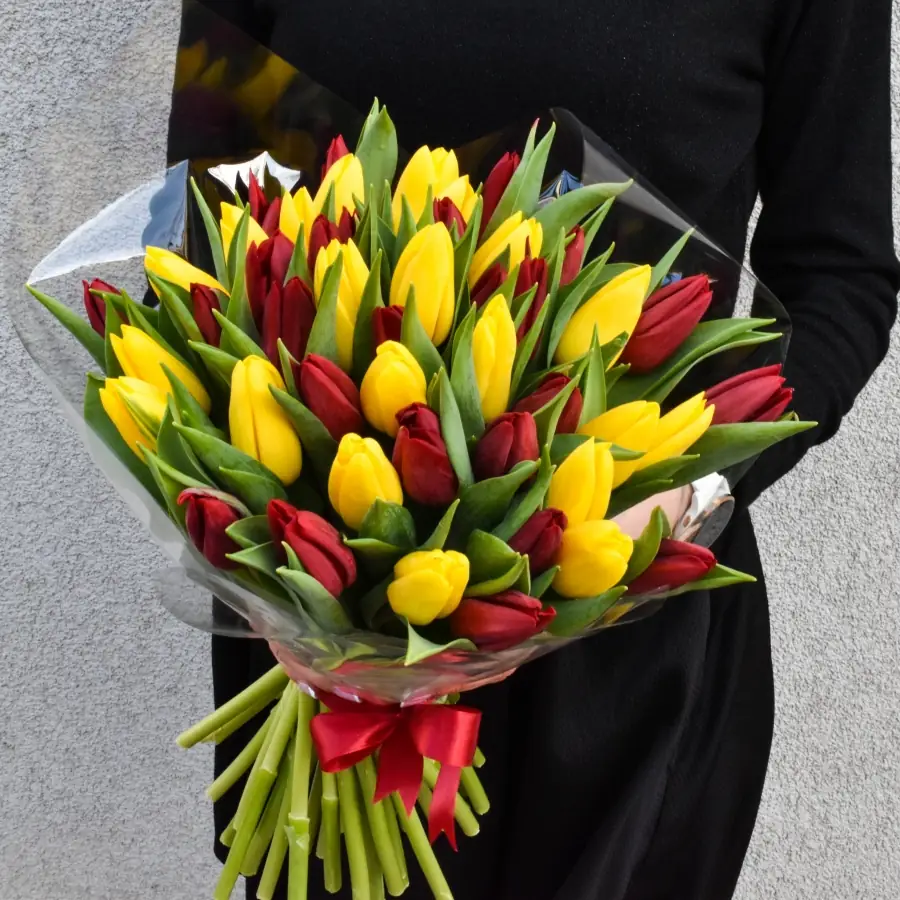 45 Желтых и Красных пионовидных Тюльпанов — купить по цене от 10350 руб. с доставкой в Нижнем Новгороде