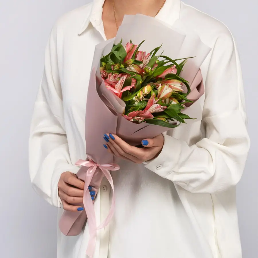 Альстромерию часто путают с орхидеей – роскошные соцветия притягивают взгляд. Асимметричные лепестки с высветленной серединкой и характерными отметинами более темного цвета в окружении глянцевых листьев на длинном стебле смотрятся обворожительно. Второе название растения – Перуанская лилия, цветочная культура получила в честь родины, где почиталась инками даром богов, прикасаться к которому могли лишь жрецы. Познакомил с ней Европу швед – граф Клаус Альстромер, привёзший несколько клубней из Перу. Он увлекался ботаникой и был поражен красотой цветка. Альстромерия бело-розовая имеет необычную, пеструю расцветку нежного оттенка. Любопытно, что на языке цветов Перуанская лилия значит дружбу, поддержку, любовь родителей и детей. Дарить букет из 5 бело-розовых альстромерий можно на любое торжество – романтического окраса растение не несет. При этом альстромерия – это цветок, который не пахнет, а значит преподнести его можно людям страдающим аллергией. Онлайн гипермаркет База Цветов предлагает оригинальный, роскошный букет 5 бело-розовых альстромерий в дизайнерской упаковке