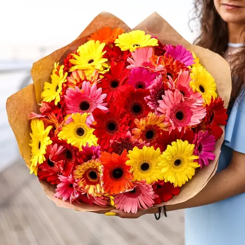 51 Разноцветная Гербера в крафте — купить по цене от 13340 руб. с доставкой в Нижнем Новгороде