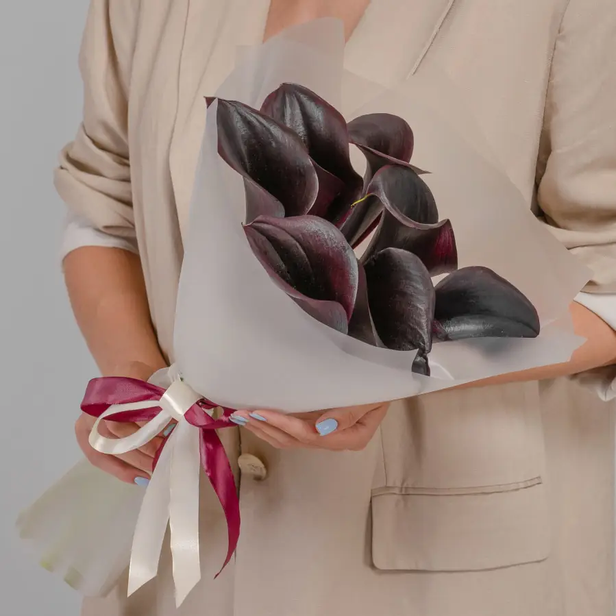 На фото - Чёрный букет у упаковке . В составе данной композиции: Калла - 7 шт, Дизайнерская упаковка, Лента атласная, . На сайте sbuket-nn.ru Вы найдете большой выбор недорогих букетов, цветочных композиций для любого повода. У нас можно заказать Чёрный букет у упаковке за 4570 руб.