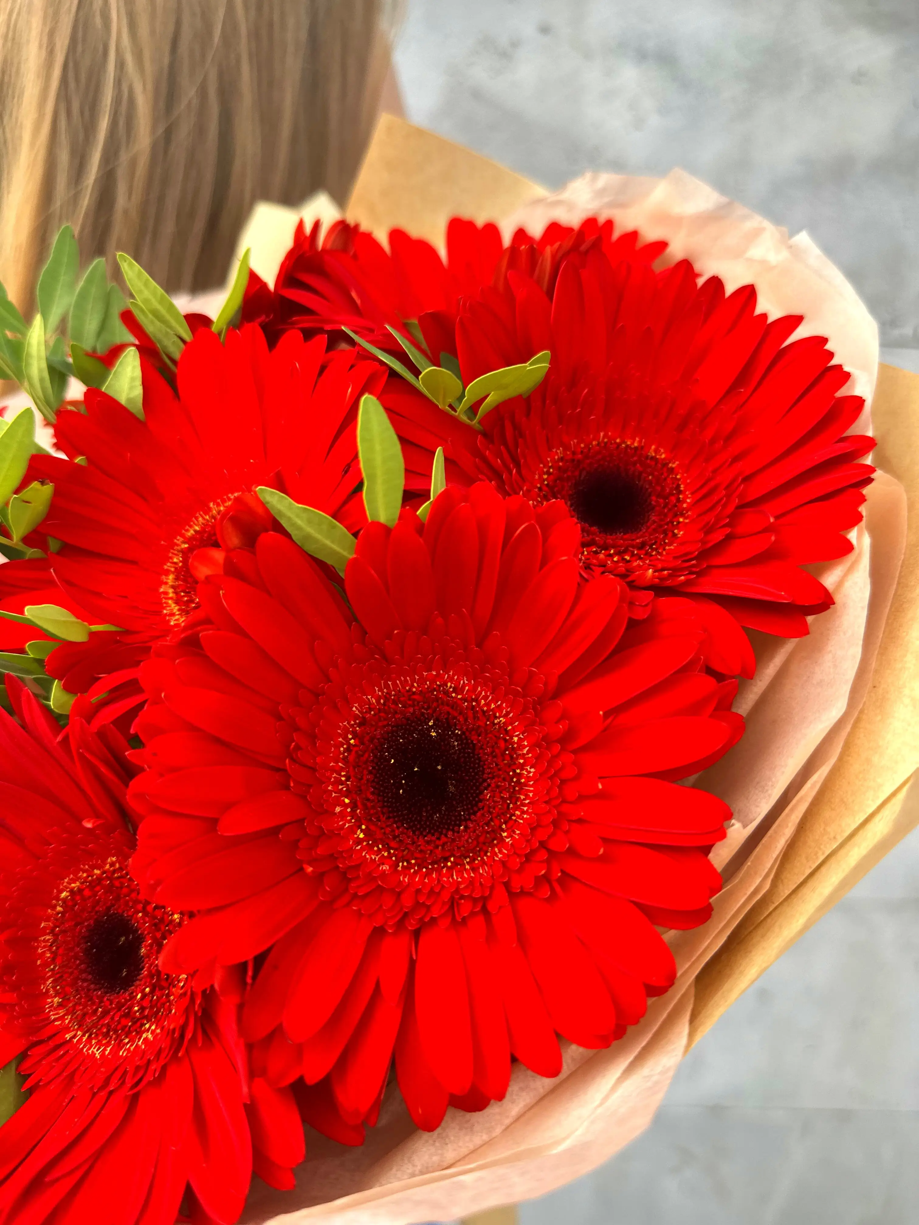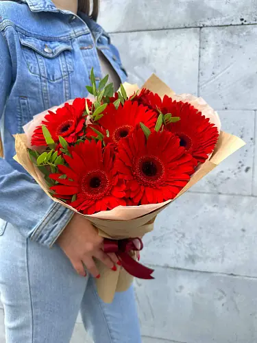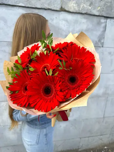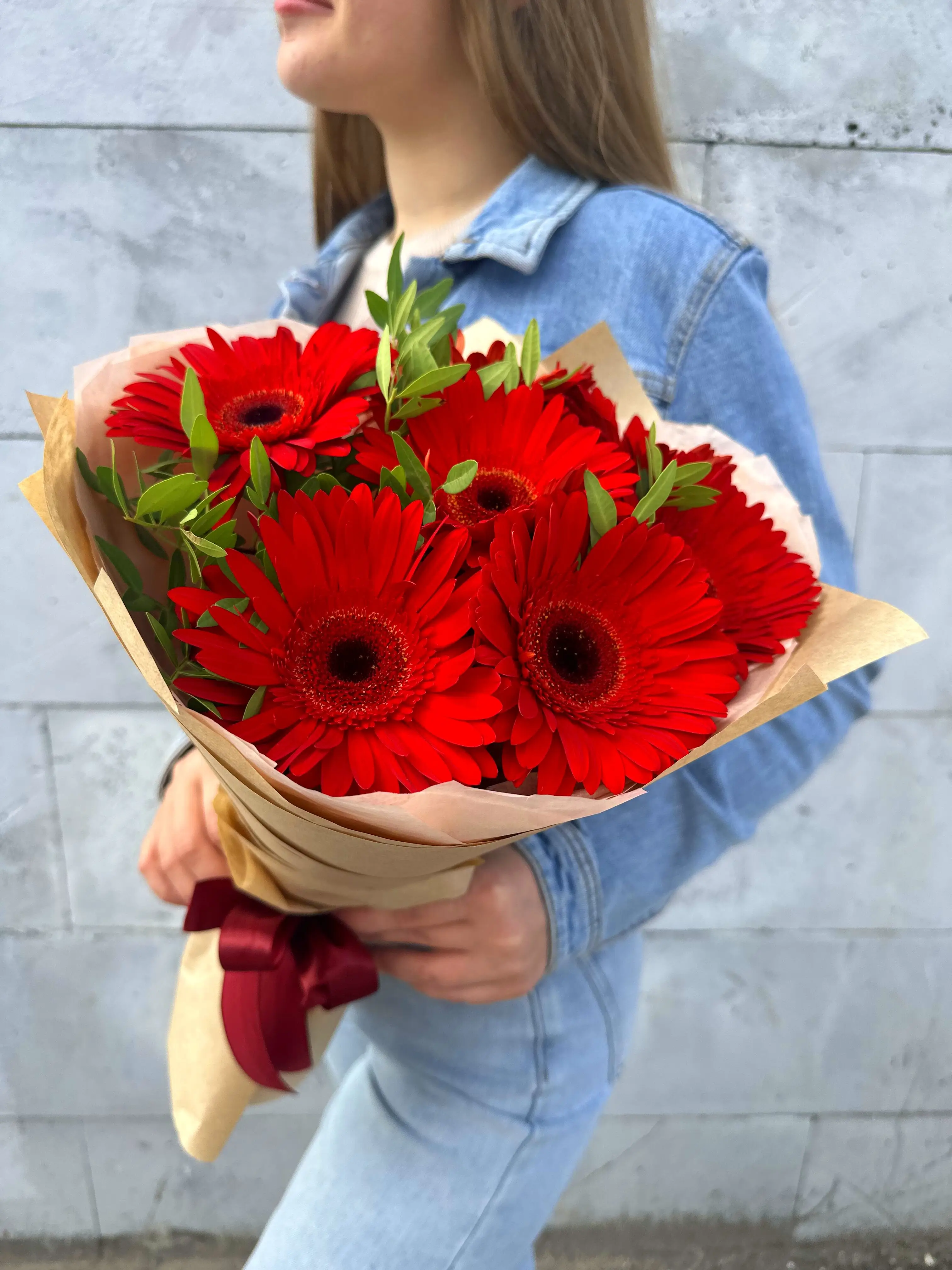 7 Красных гербер с зеленью — купить по цене от 2400 руб. с доставкой в Нижнем Новгороде