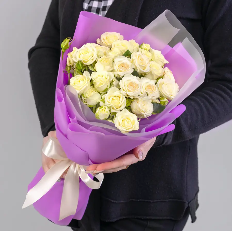 На фото - Букет из белых Роз в упаковке 9 шт. В составе данной композиции: Роза Кустовая - 9 шт, Дизайнерская упаковка, Лента атласная , . На сайте sbuket-nn.ru Вы найдете большой выбор недорогих букетов, цветочных композиций для любого повода. У нас можно заказать Букет из белых Роз в упаковке 9 шт за 3800 руб.