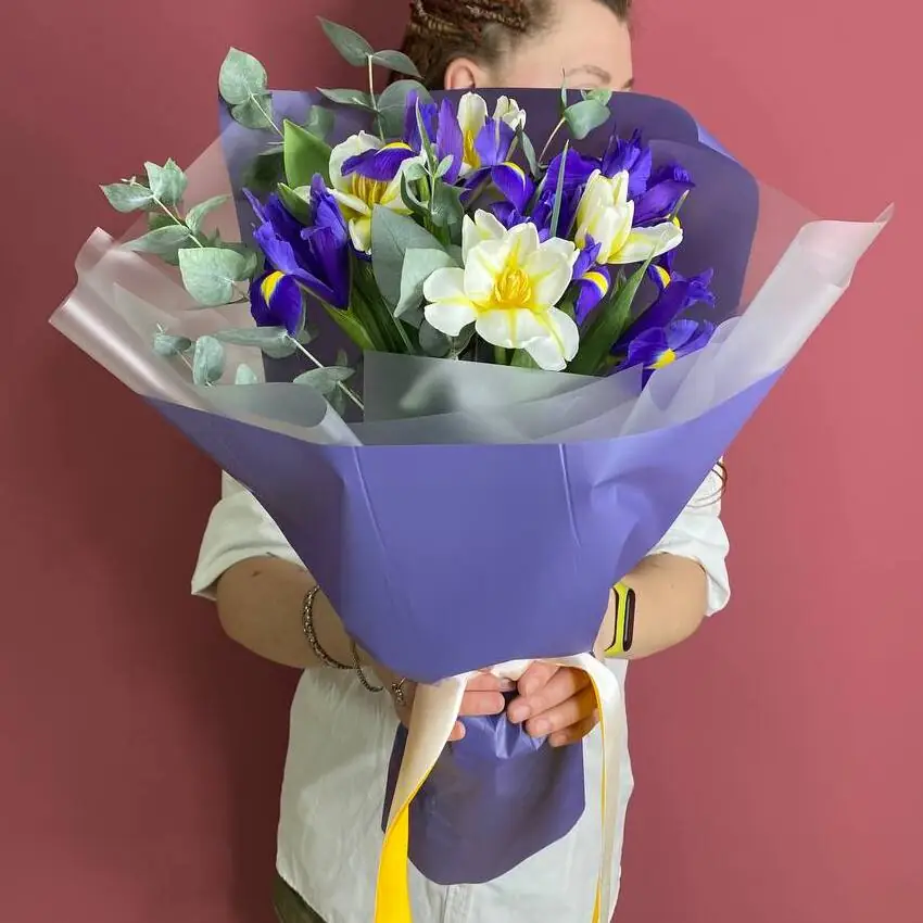 Авторский букет с тюльпанами и ирисами — купить по цене от 2940 руб. с доставкой в Нижнем Новгороде