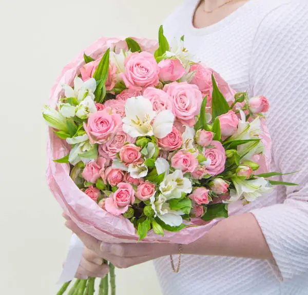Нежный букет из кустовых пионовидных роз и альстромерий. Для утонченных, романтичных и женственных натур.
