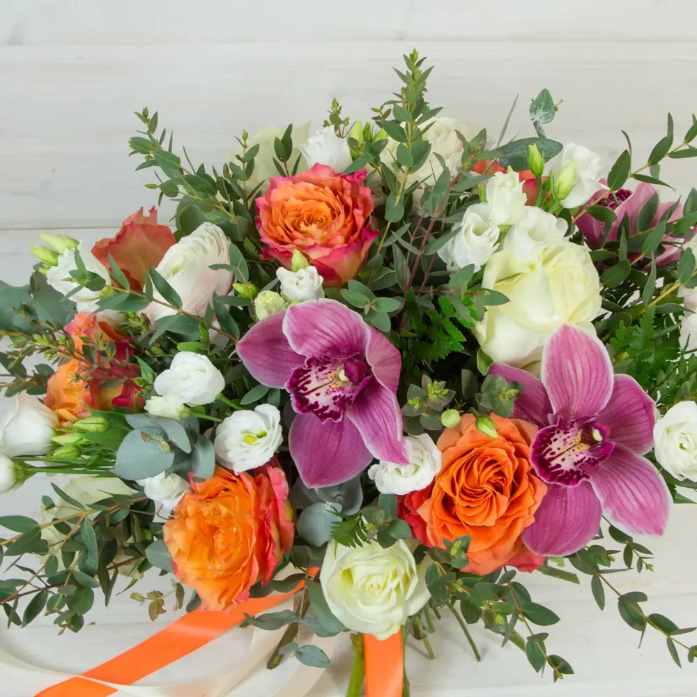 Букет "Барселона" объединяет яркие розы и эффектные орхидеи в необычный, но стильный дуэт.