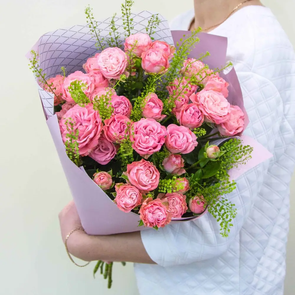 Великолепные кустовые пионовидные розы в окружении зелени и модной упаковке - тот букет, который останется в памяти надолго!