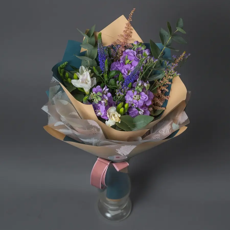 На фото - Полевой Букет Цветов. В составе данной композиции: Матиола - 3 шт., Фрезия - 2 шт., Зелень, Упаковка, Лента атласная, . На сайте sbuket-nn.ru Вы найдете большой выбор недорогих букетов, цветочных композиций для любого повода. У нас можно заказать Полевой Букет Цветов за 2980 руб.