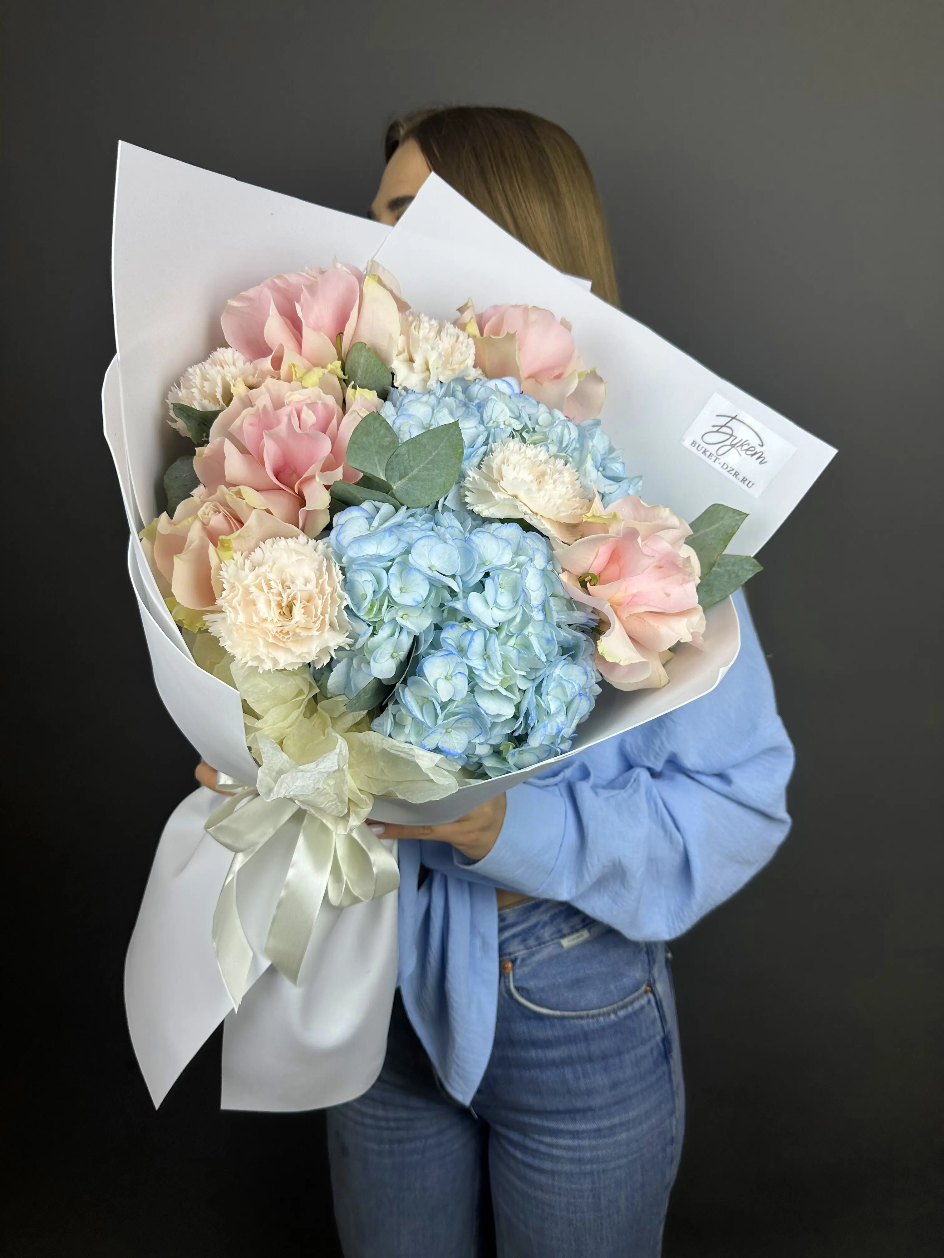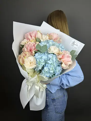 Розы и голубая гортензия — купить по цене от 4920 руб. с доставкой в Нижнем Новгороде