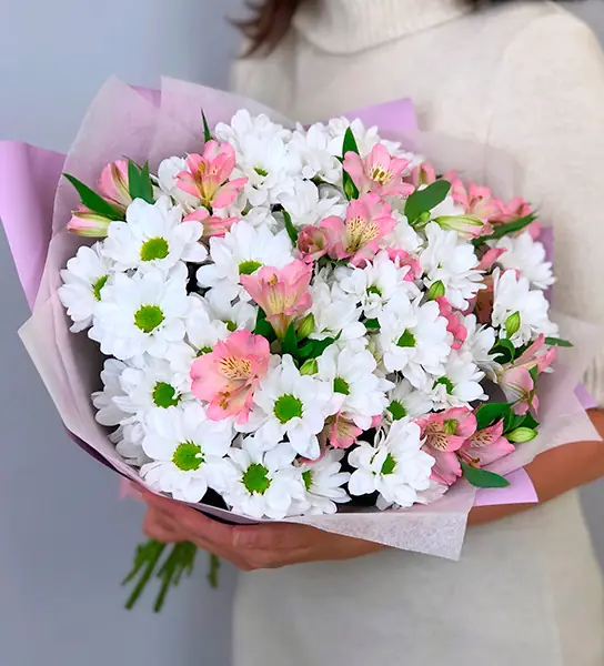 Самые искренние чувства, нежные признания, слова любви и обожания - все это выражено в нежном букете, пожалуй из самых стойких цветов - хризантем и альстромерий