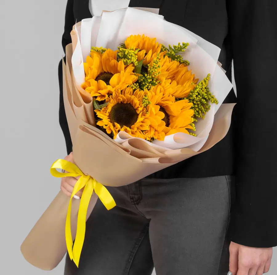 Подсолнухи и солидаго в упаковке