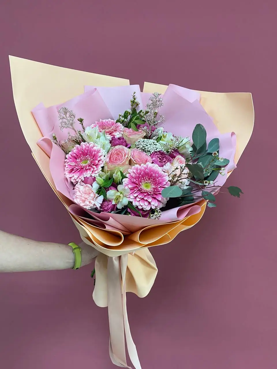 Соберем в день доставки, только из свежих цветов и затем с улыбкой вручим получателю.
