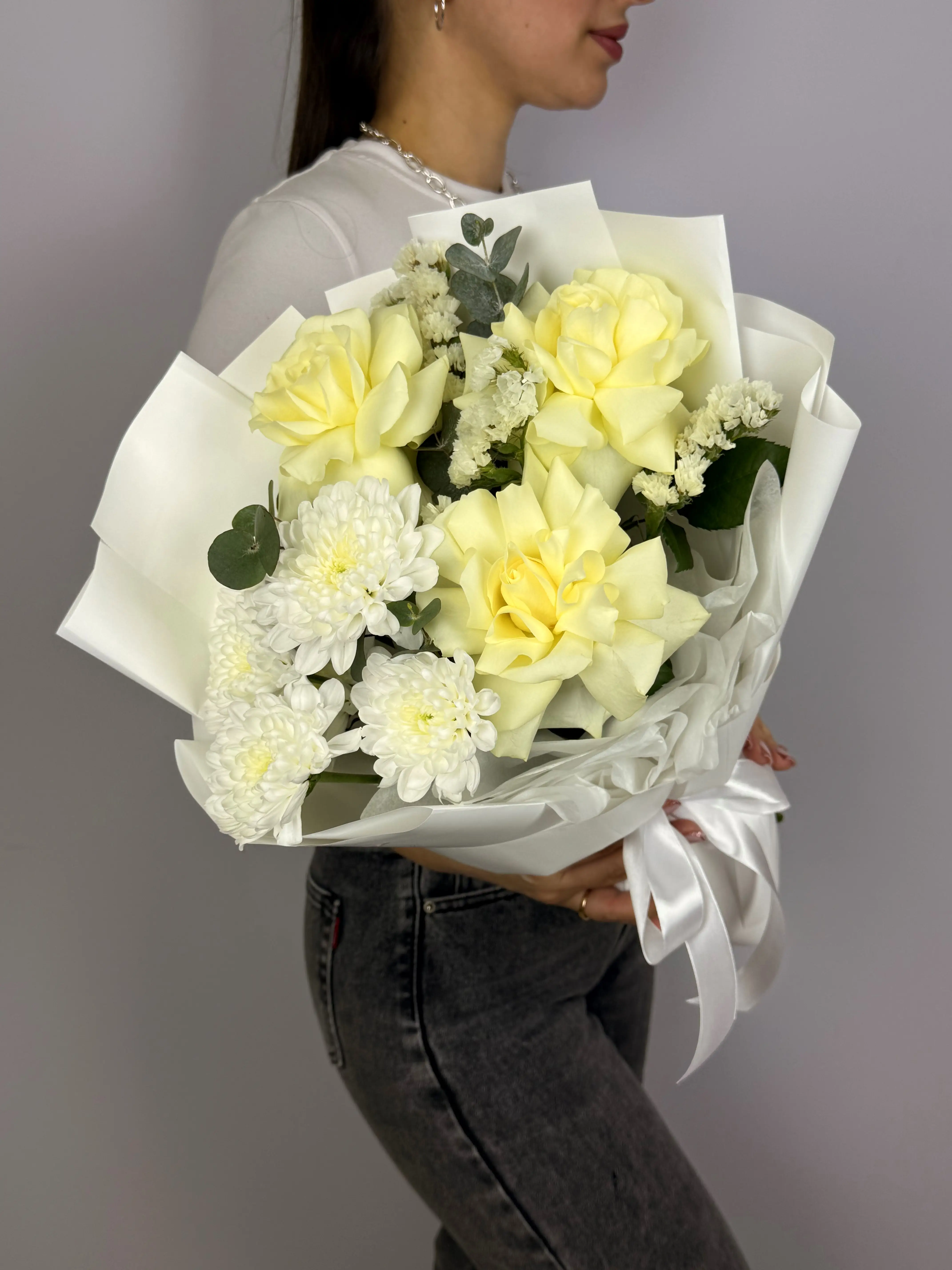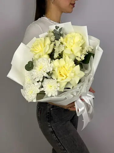 Букет из роз с хризантемой и зеленью — купить по цене от 2237 руб. с доставкой в Нижнем Новгороде
