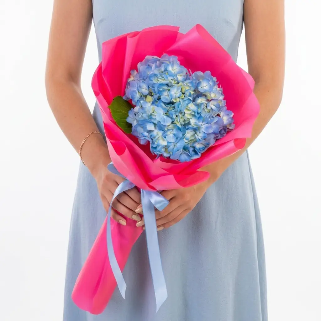 На фото - Букет из голубой гортензии. В составе данной композиции: Гортензия - 1 шт, Дизайнерская упаковка, Лента атласная, . На сайте sbuket-nn.ru Вы найдете большой выбор недорогих букетов, цветочных композиций для любого повода. У нас можно заказать Букет из голубой гортензии за 1800 руб.