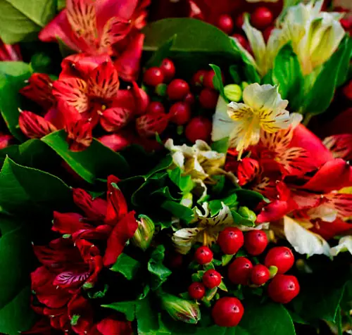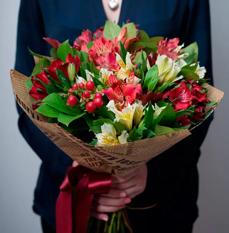 Милый и чувственный букет. Пестрые лепестки альстромерии в сочетании с ягодками гиперикума создают необычную и торжественную композицию. Этот букет - универсальный подарок как для любимых, так и для коллег.
