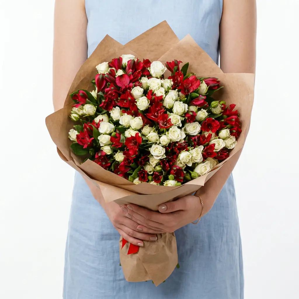 На фото - Букет "Красные Альстромерии и Розы". В составе данной композиции: Роза Кустовая Белая - 15 шт., Альстромерия Красная - 12 шт., Упаковка, Лента атласная, . На сайте sbuket-nn.ru Вы найдете большой выбор недорогих букетов, цветочных композиций для любого повода. У нас можно заказать Букет "Красные Альстромерии и Розы" за 9520 руб.