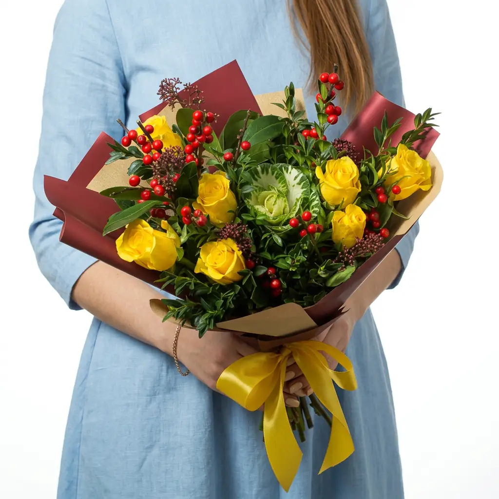 На фото - Букет "Летняя Свежесть". В составе данной композиции: Илекс - 3 шт., Роза Желтая - 7 шт., Брассика Зелено-Белая - 1 шт., Зелень, Упаковка, Лента атласная, . На сайте sbuket-nn.ru Вы найдете большой выбор недорогих букетов, цветочных композиций для любого повода. У нас можно заказать Букет "Летняя Свежесть" за 4220 руб.