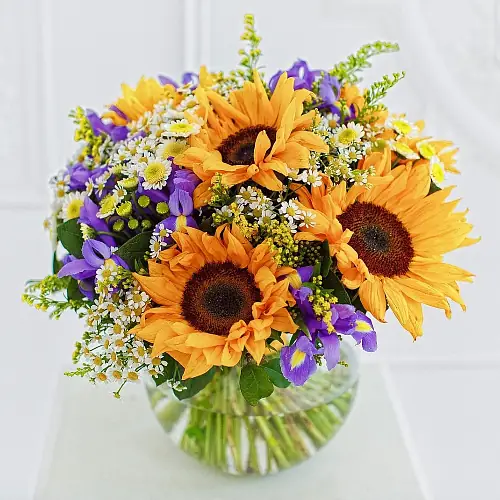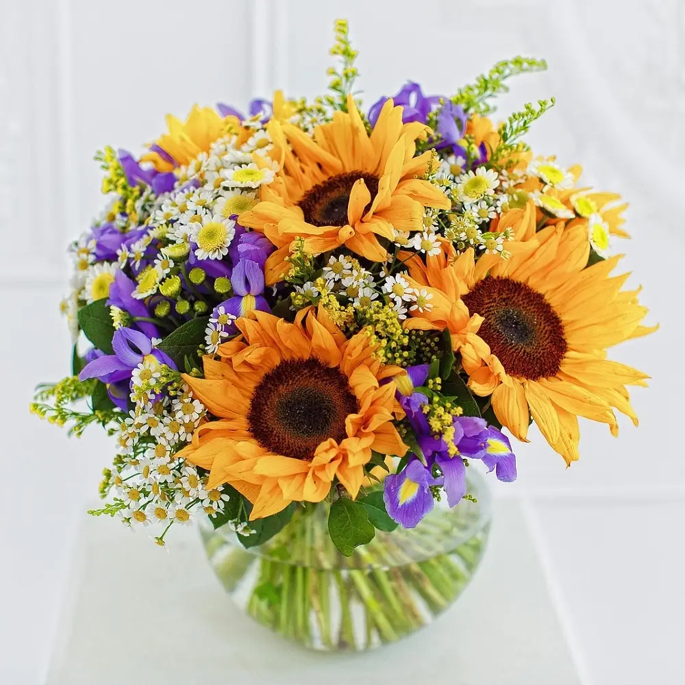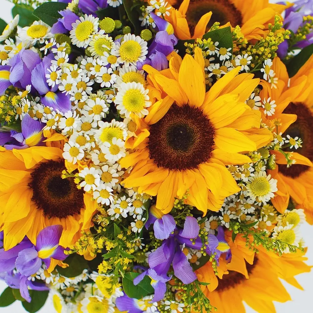 Самые солнечные цветы - подсолнухи в окружении нежных ромашек и фиолетовых ирисов наполнят дом счастливыми воспоминаниями о веселых и беззаботных летних деньках.