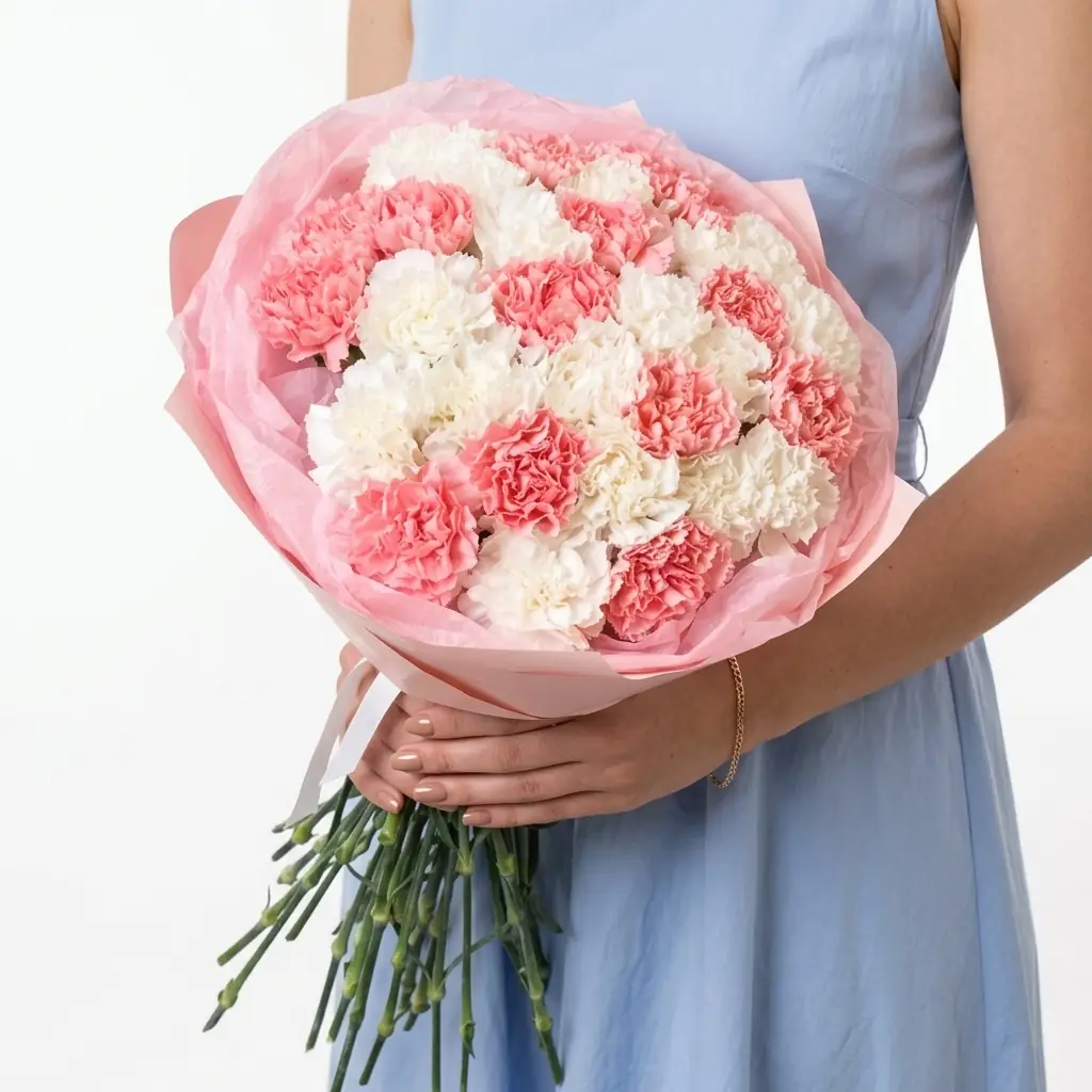 Нежный букет в бело-розовых тонах с чудесными гвоздиками.
