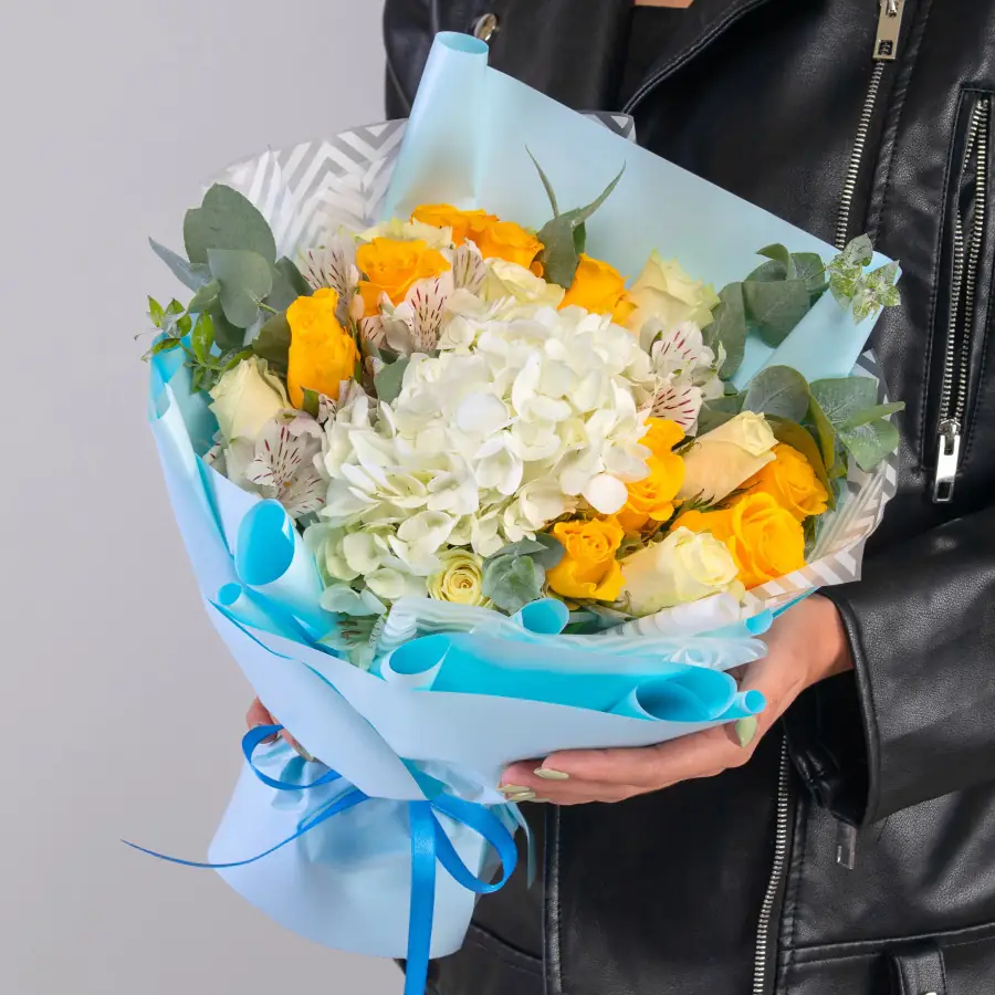Соберем в день доставки, только из свежих цветов и затем с улыбкой вручим получателю.