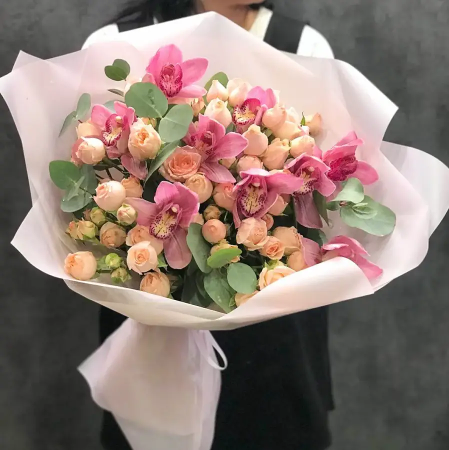 На фото - Букет розовый. В составе данной композиции: Орхидея Цимбидиум Розовая (1 цветок) - 9 шт., роза пионовидная кустовая - 10 шт., Эвкалипт, Упаковка, Лента атласная, . На сайте sbuket-nn.ru Вы найдете большой выбор недорогих букетов, цветочных композиций для любого повода. У нас можно заказать Букет розовый за 6840 руб.