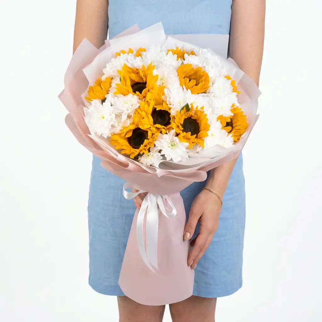 Подсолнухи и Хризантемы Кустовые Белые — купить по цене от 6900 руб. с доставкой в Нижнем Новгороде