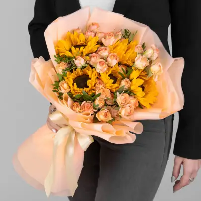 Букет подсолнухов с кустовой розой — купить по цене от 4750 руб. с доставкой в Нижнем Новгороде