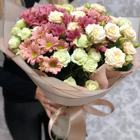 На фото - Букет "Робкий Поцелуй". В составе данной композиции: Роза кустовая - 7 шт., Хризантема кустовая - 4 шт., Упаковка, Лента атласная, . На сайте sbuket-nn.ru Вы найдете большой выбор недорогих букетов, цветочных композиций для любого повода. У нас можно заказать Букет "Робкий Поцелуй" за 4720 руб.