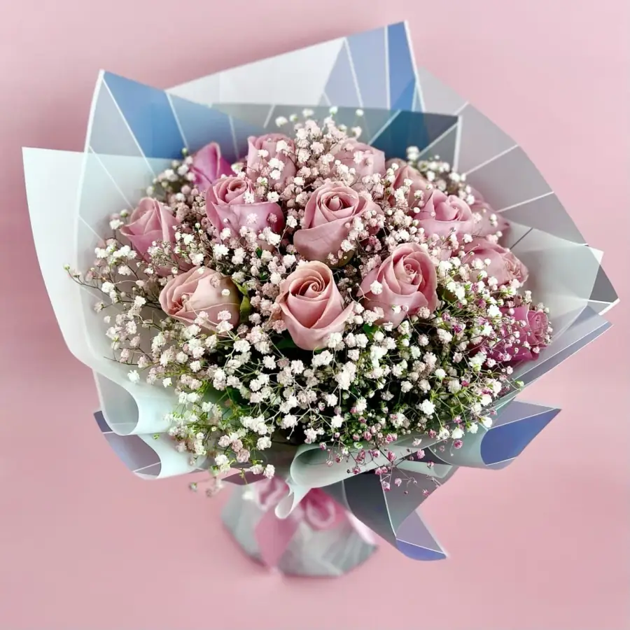 На фото - Букет "Розовое Кружево". В составе данной композиции: Роза (40см) - 15 шт., Гипсофила цветная - 3 шт., Упаковка, Лента атласная, . На сайте sbuket-nn.ru Вы найдете большой выбор недорогих букетов, цветочных композиций для любого повода. У нас можно заказать Букет "Розовое Кружево" за 3865 руб.