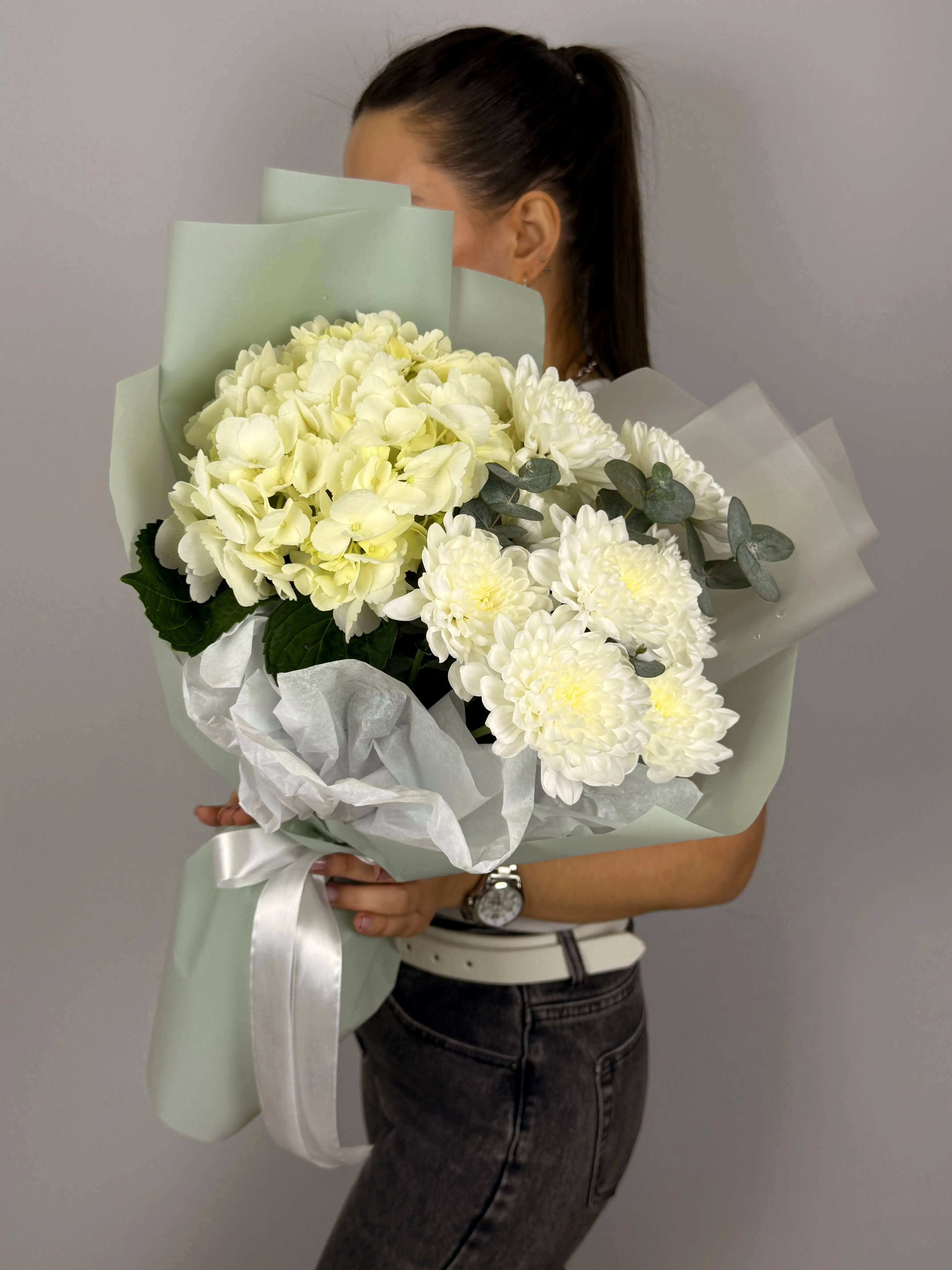 Букет с белой гортензией и хризантемой — купить по цене от 2610 руб. с доставкой в Нижнем Новгороде