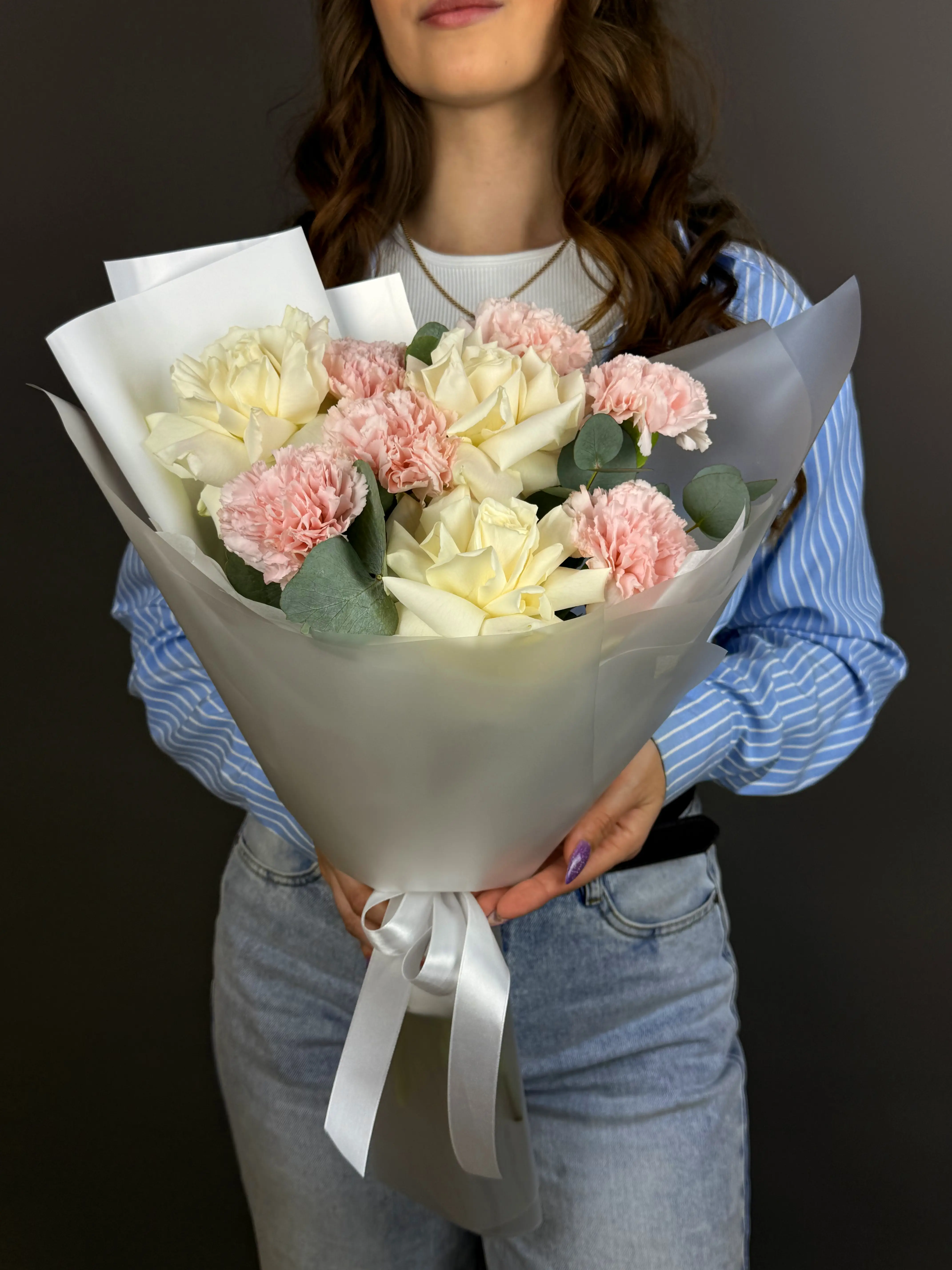 Букет с диантусами и белыми розами — купить по цене от 3235 руб. с доставкой в Нижнем Новгороде