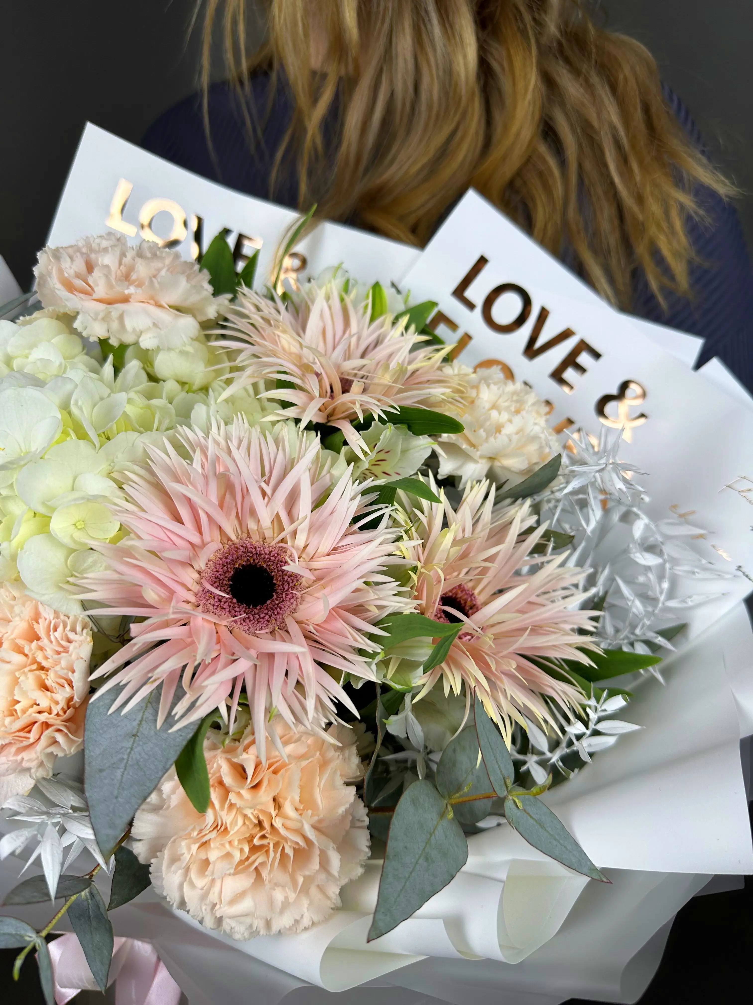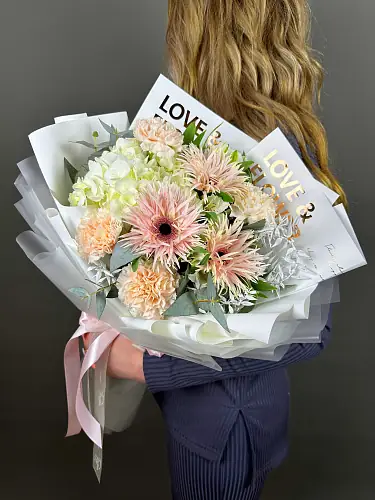Соберем в день доставки, только из свежих цветов и затем с улыбкой вручим получателю.