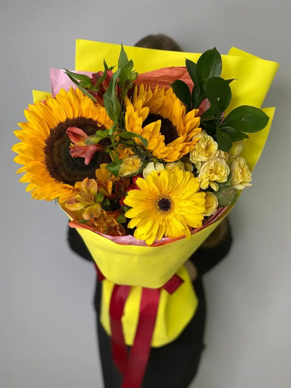 Букет с герберой ,подсолнухами и розами — купить по цене от 3240 руб. с доставкой в Нижнем Новгороде