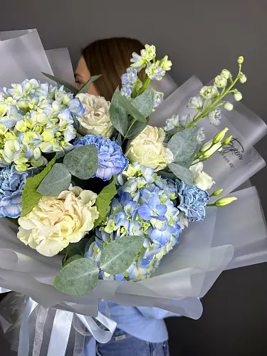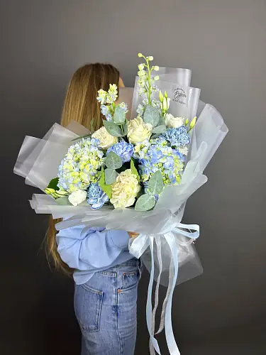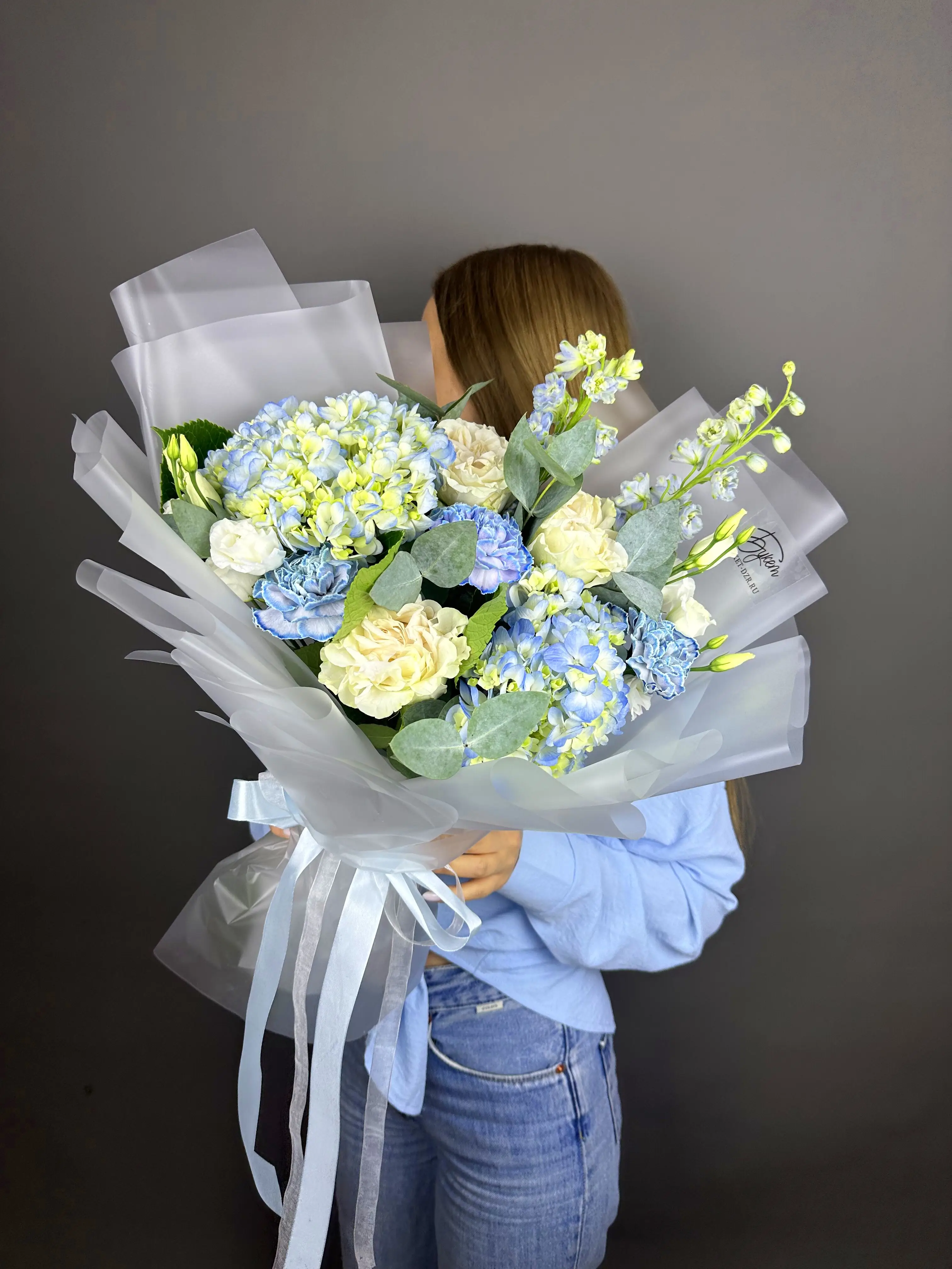Букет с голубой гортензией и дельфиниумом — купить по цене от 5910 руб. с доставкой в Нижнем Новгороде