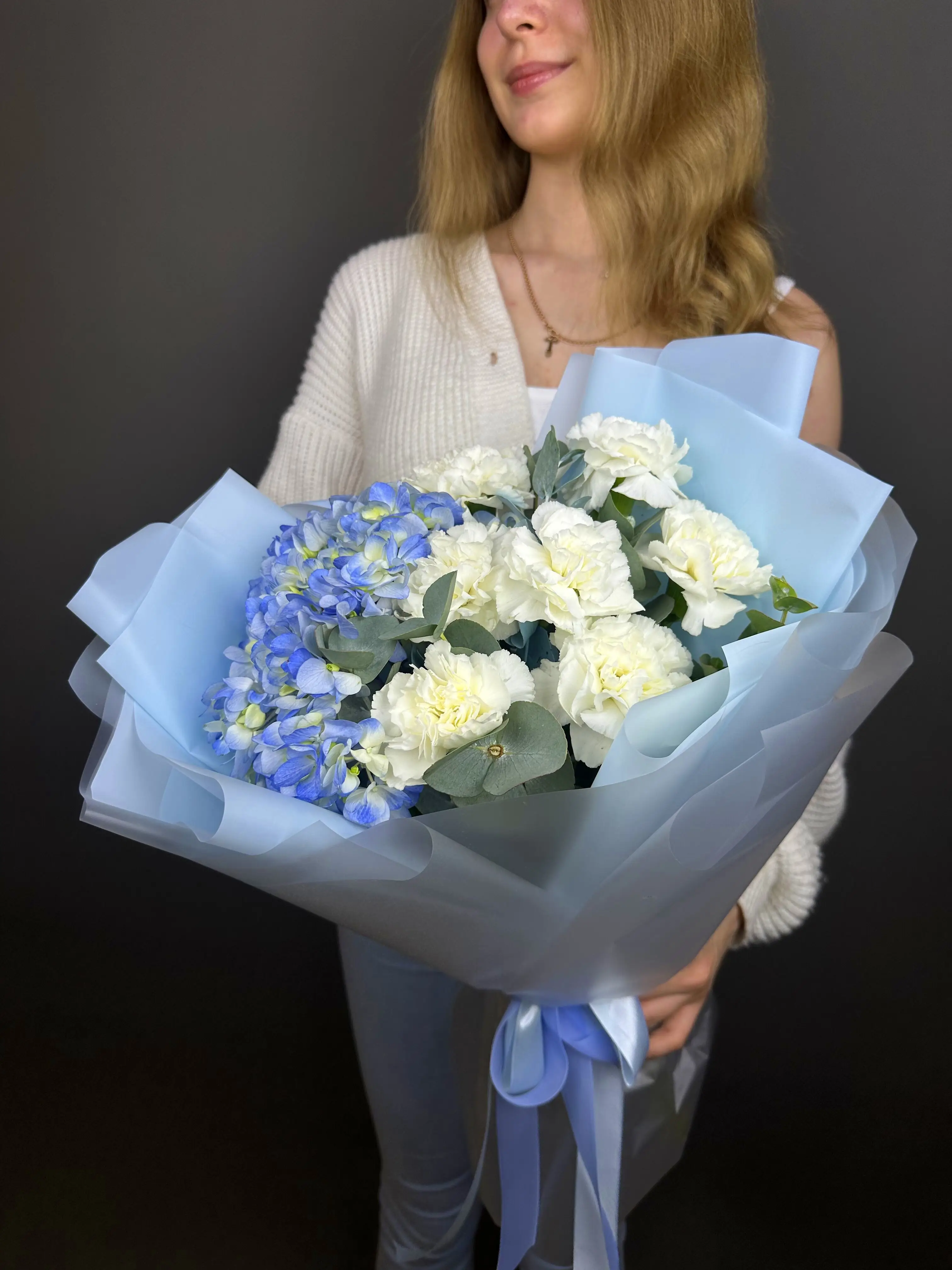 Букет с голубой гортензией и гвоздикой — купить по цене от 3310 руб. с доставкой в Нижнем Новгороде