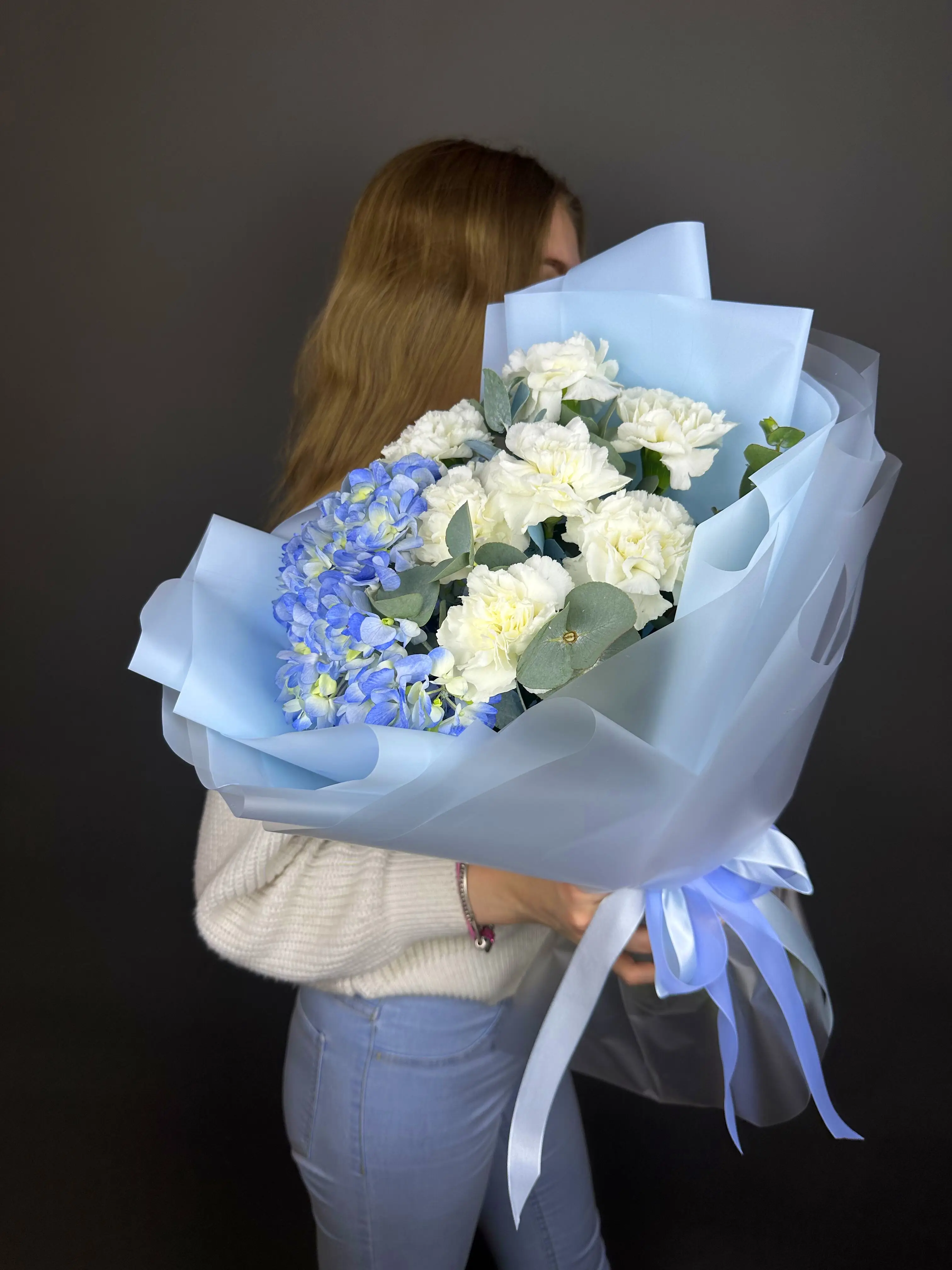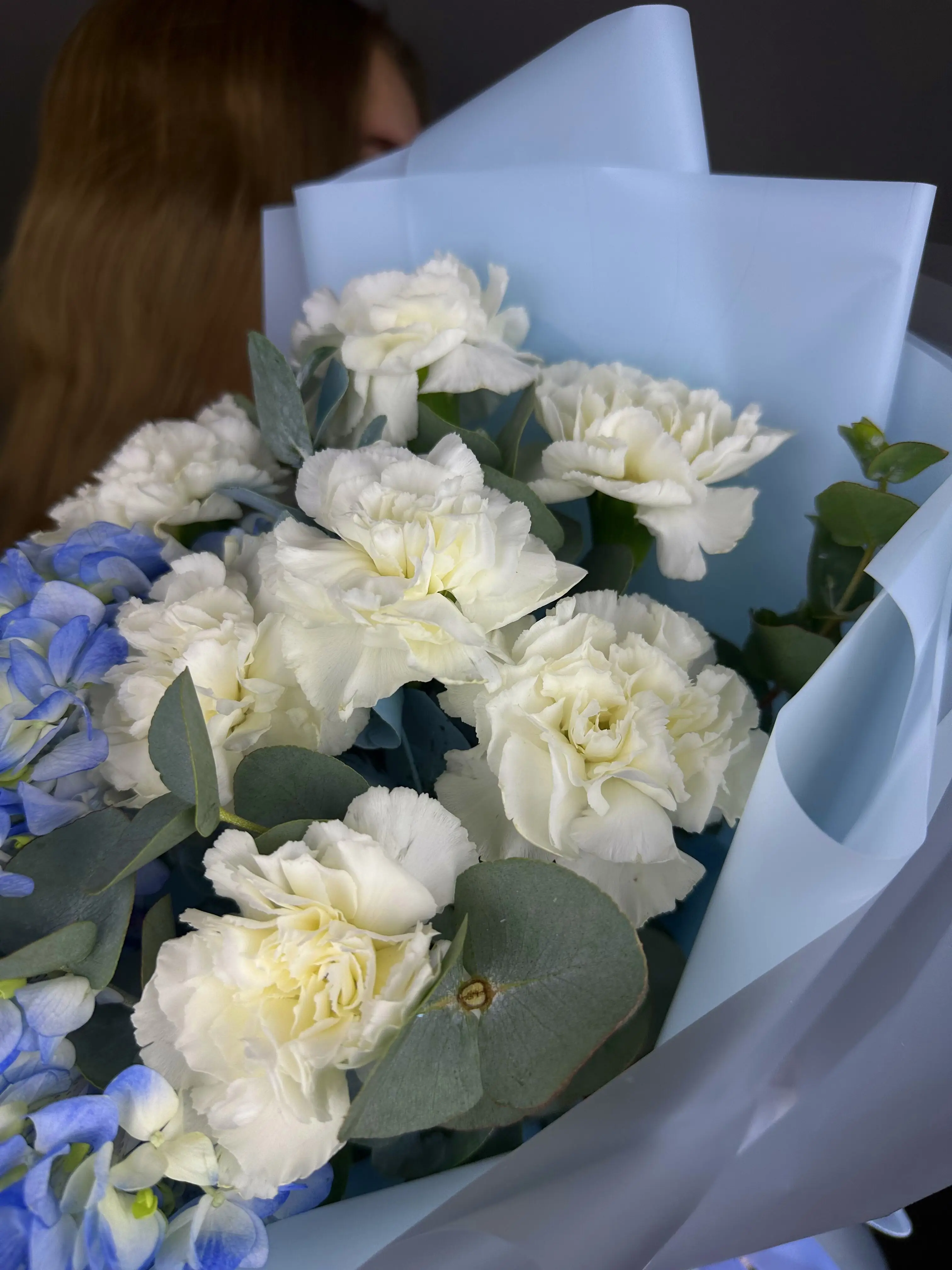 Букет с голубой гортензией и гвоздикой