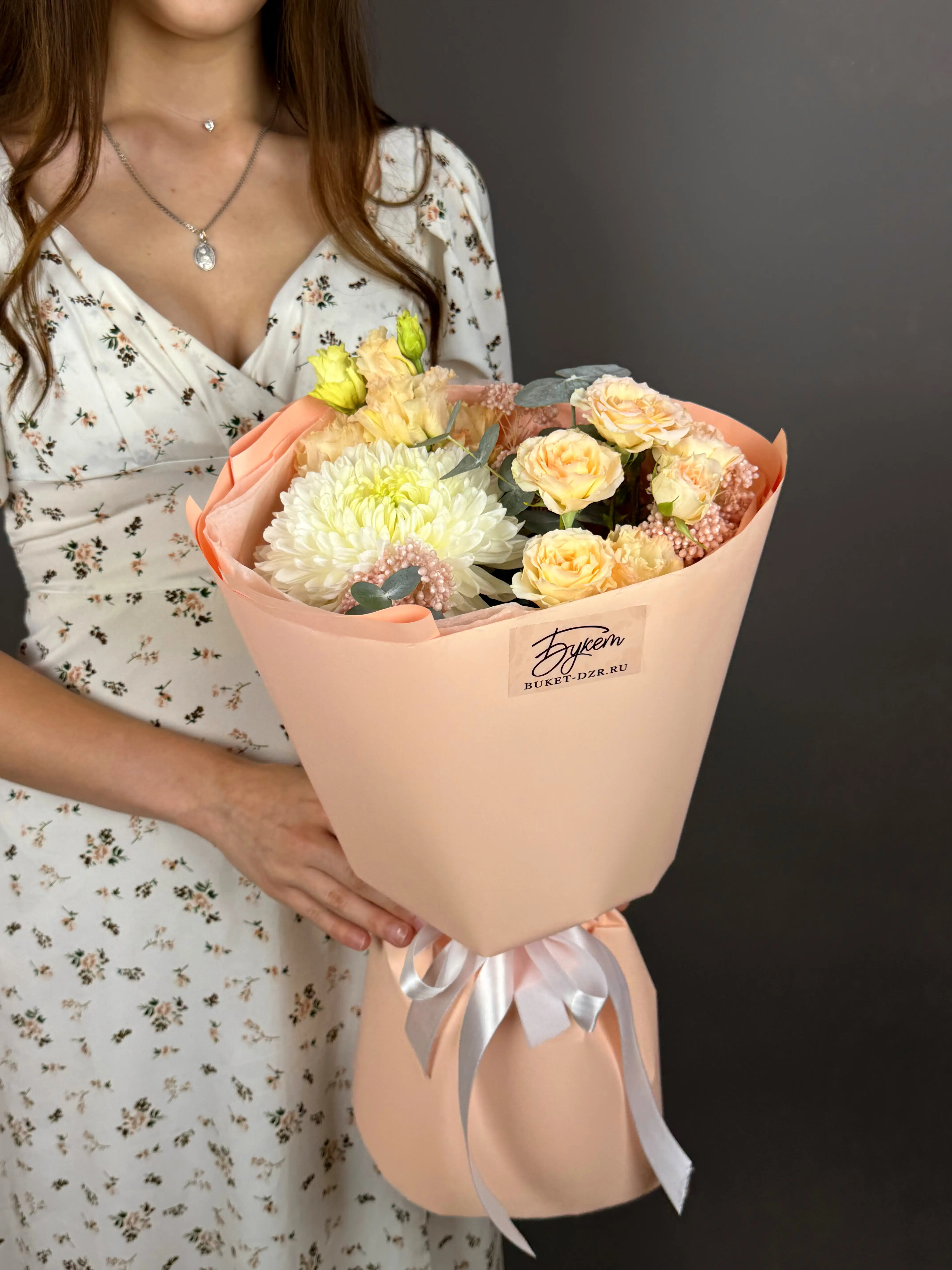 Букет с одноголовой хризантемой и эустомой