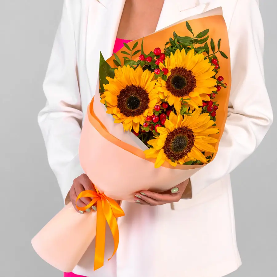 На фото - Букет с подсолнухами . В составе данной композиции: Подсолнух - 3 шт, Гиперикум - 3 шт, Зелень, Дизайнерская упаковка, Лента атласная, . На сайте sbuket-nn.ru Вы найдете большой выбор недорогих букетов, цветочных композиций для любого повода. У нас можно заказать Букет с подсолнухами за 2350 руб.