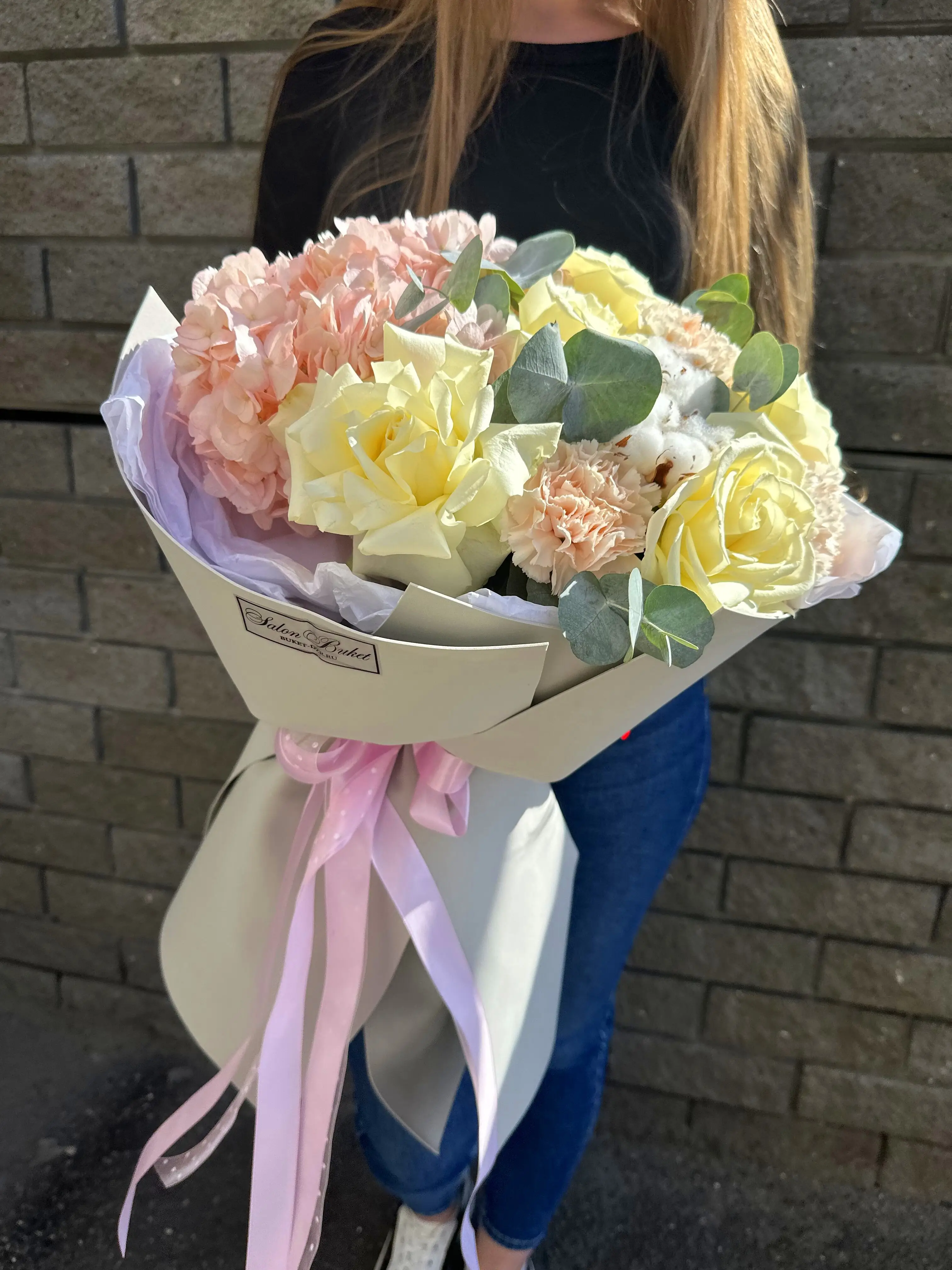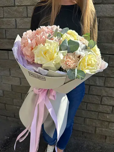 Соберем в день доставки, только из свежих цветов и затем с улыбкой вручим получателю.