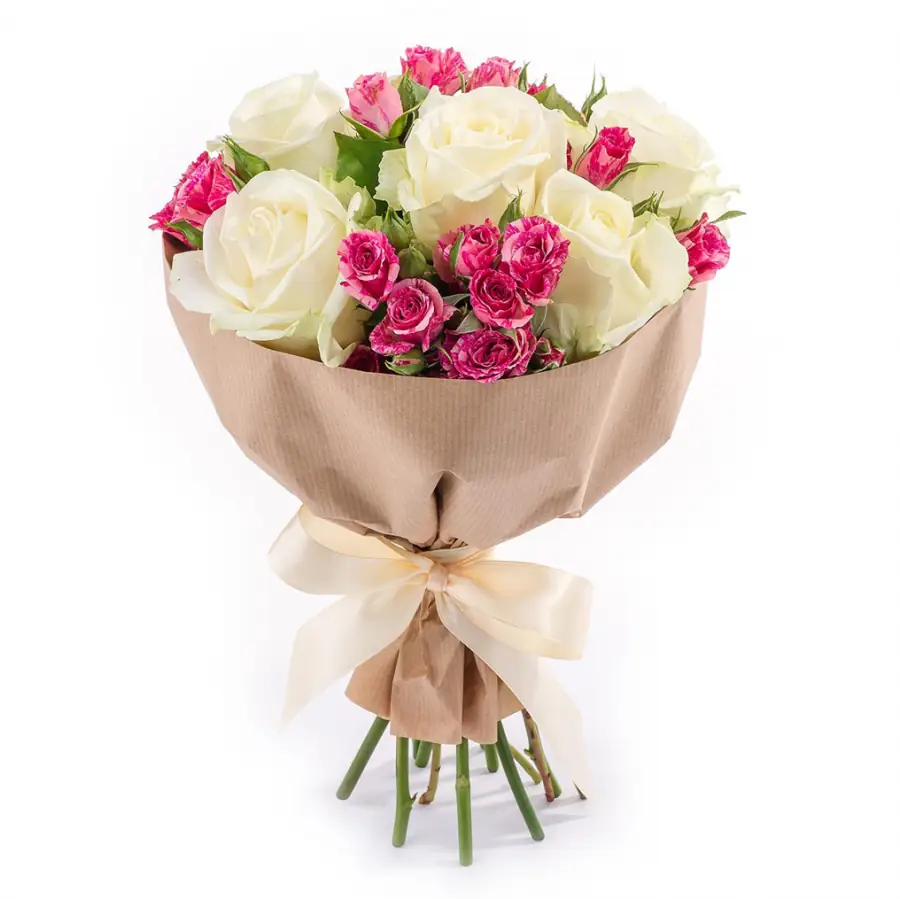На фото - Букет "Сладкий Ноябрь". В составе данной композиции: Роза - 5 шт., Роза кустовая - 4 шт., Упаковка, Лента атласная, . На сайте sbuket-nn.ru Вы найдете большой выбор недорогих букетов, цветочных композиций для любого повода. У нас можно заказать Букет "Сладкий Ноябрь" за 3500 руб.
