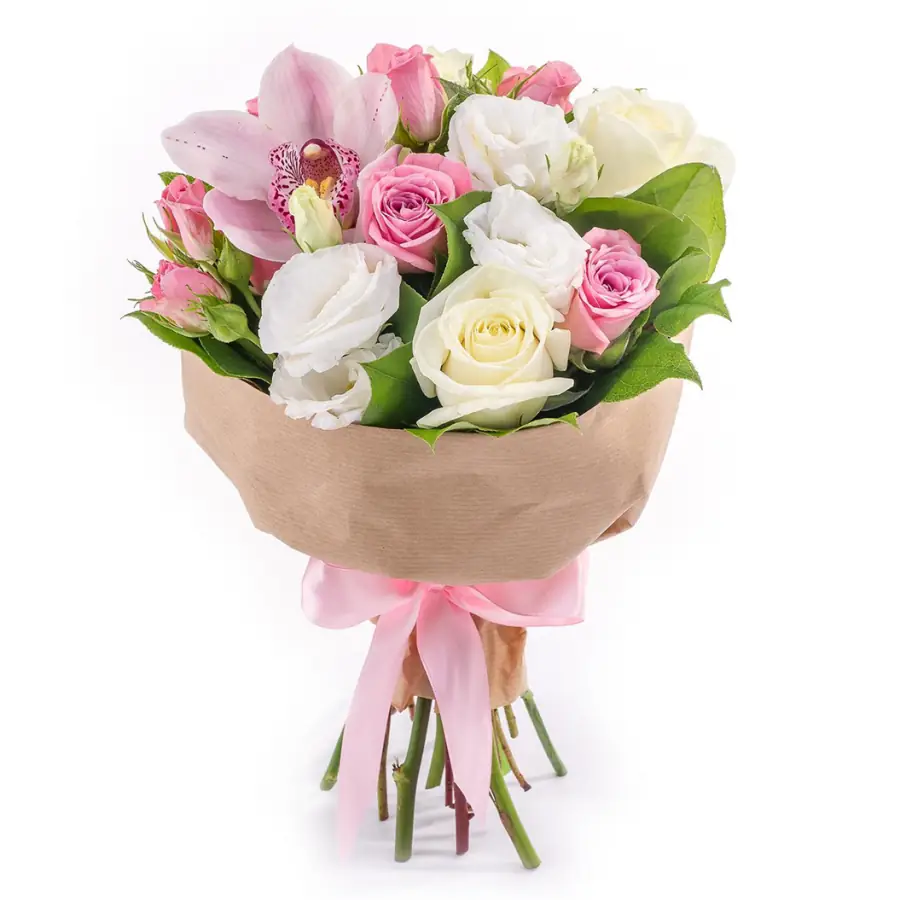 На фото - Букет "Сладкий Сон". В составе данной композиции: Роза - 5 шт., Орхидея - 1 шт., Роза кустовая - 2 шт., Эустома - 2 шт., Зелень, Упаковка, Лента атласная, . На сайте sbuket-nn.ru Вы найдете большой выбор недорогих букетов, цветочных композиций для любого повода. У нас можно заказать Букет "Сладкий Сон" за 4010 руб.