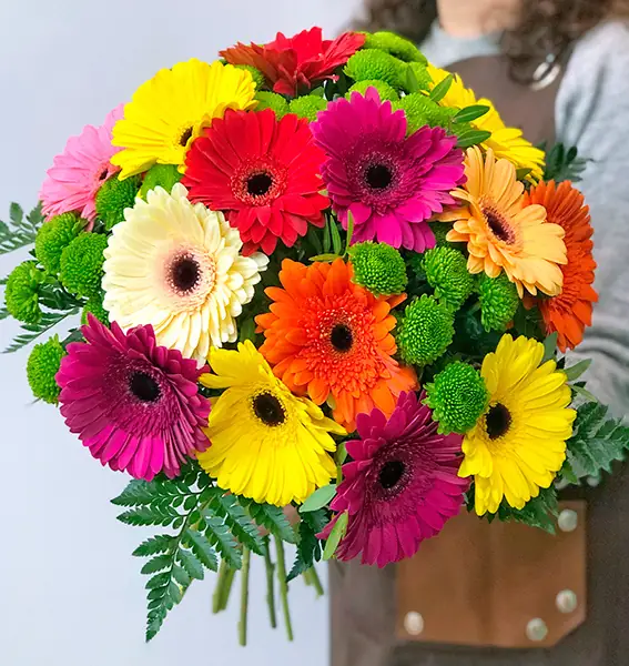 Если Вы любите герберы, то яркий жизнерадостный микс из мини-гербер и хризантемы сантини - то, что нужно! Отличный букет для поднятия настроения в любую погоду.