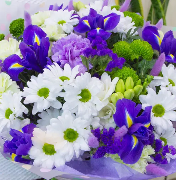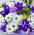 Объемный букет из ирисов, хризантем, диантуса в бело-фиолетовых тонах. Для женщины любого статуса и положения. Но особенно букет "Анжелика" подойдет как цветочный презент на юбилей или день рождения.