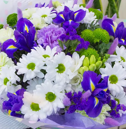 На фото - Букет цветов "Анжелика". В составе данной композиции: Ирис - 6 шт., Диантус - 7 шт., Хризантема кустовая - 3 шт., Фрезия - 3 шт., Зелень, Упаковка, Лента атласная, . На сайте sbuket-nn.ru Вы найдете большой выбор недорогих букетов, цветочных композиций для любого повода. У нас можно заказать Букет цветов "Анжелика" за 5970 руб.