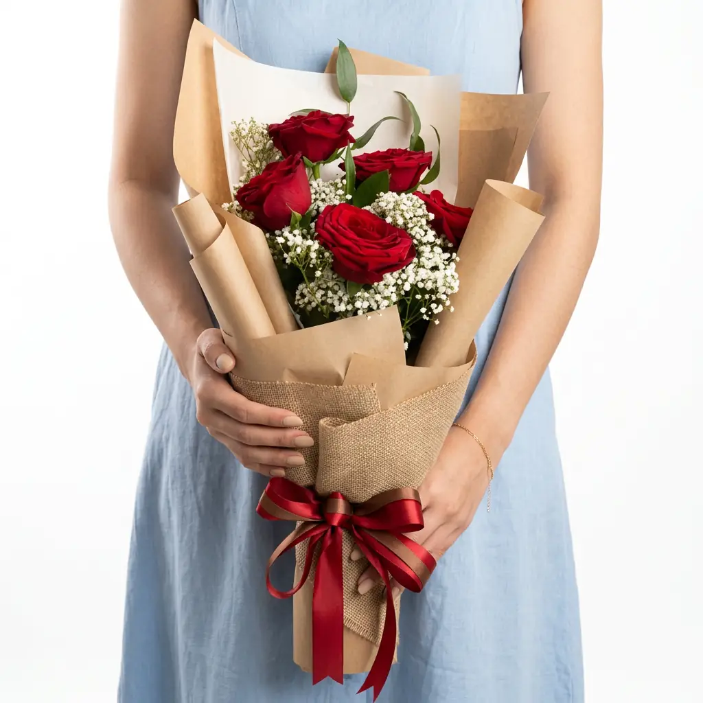 На фото - Букет "Тёплые Слова". В составе данной композиции: Роза - 5 шт., Зелень, Упаковка, Лента атласная, . На сайте sbuket-nn.ru Вы найдете большой выбор недорогих букетов, цветочных композиций для любого повода. У нас можно заказать Букет "Тёплые Слова" за 3170 руб.